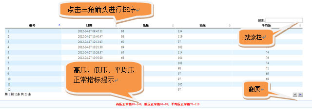 表格方式显示结果页面中,用户可以通过对编号、日期、低压、高压、平均压排序来观察各项身体指标。