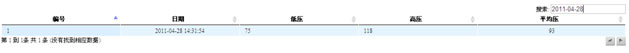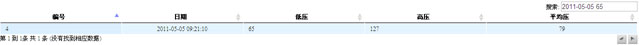 在搜索中输入低压值、高压值、平均压数值均可进行查询,也可以组合搜索,如在搜索中输入:2011-05-05 65,如下图。