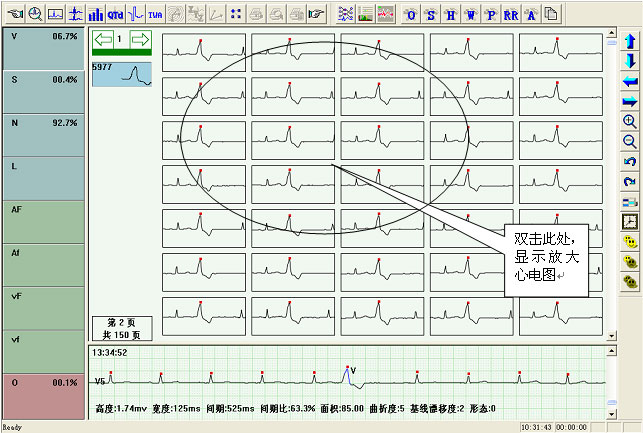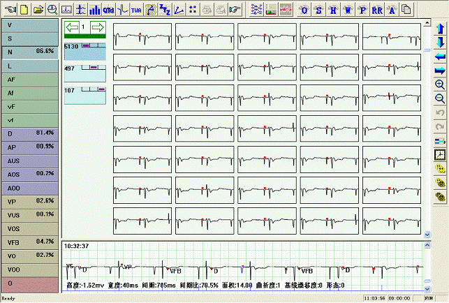 左窗是模板窗,每一个按钮为一个模板。按钮上的字母为类型(如v为室早,s为房早),按钮上的百分数为该类占总数的百分比,为空即没有该类波形。