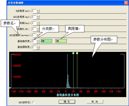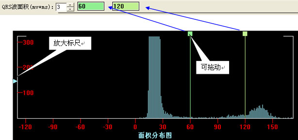 图1-9为参数分布图。纵坐标为QRS波个数,横坐标为参数值。其中的分类线条对应于上面编辑框,可用鼠标拖动分界线上的方框,改变与之对应的界限值。左边的蓝色三角形为放大标尺,可用鼠标左键上下拖动这个三角形,改变纵轴的放大倍数。