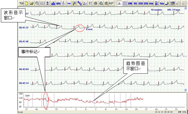 在波形显示窗口中的蓝色竖线和“Event”,以及趋势图显示窗口中心率趋势图上的蓝色竖线均为事件标记,表示用户在此时按下了事件按钮,记录了一个事件。
