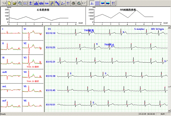图中标记“TWA起始”、“TWA终止”字样的位置为满足T波电交替判断条件的波形区间,在左边区域,为单数编号与双数编号波形的叠加效果图,其中绿线表示的是单数编号波的叠加波形,红线表示的是双数编号波的叠加波形。在波形下方有红色警告字出现,表示该波形所在的导联在该位置出现T波电交替现象。(如上图V3,V4导联)。其中的数字表示单数编号波形与双数编号波形分别进行叠加后的T波高度差值。单击波形所在的矩形,即可将右边的波形图切换至指定导联的单导波形图。图形上方的“心率趋势图”、“RR间期趋势图”表示了发生T波电交替的波形段的心率以及RR间期的变化趋势。