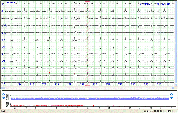 你会发现,RR间期图上大部分是浅蓝色,有一部分是深蓝色,还有一部分是灰色,另外还有一些白色的线条,它们的意义如下:浅蓝色是一般波形;深蓝色表示连续的S、V、 AF、 Af、VF、Vf (具体含义见模板说明部分)等等;灰色表示连续的伪差;白色的线条表示干扰段。