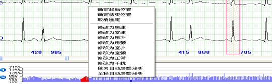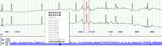 根据RR间期图用户可以大概判断房颤发生时间及长短,综合其对应的多导显示图,如果确认一段是房颤等,可以在RR间期图上点右键调出下图所示菜单:确认起始位置和结束位置选择一段,所选段变成红色以后,用户可以选择将该修为房速、室速、房扑、房颤、室扑、室颤、正常、干扰,同时用户也可一对该段作自动房颤分析,让机器自动判断。你也可以在开始的时候不选择段,而对全程作自动房颤分析。